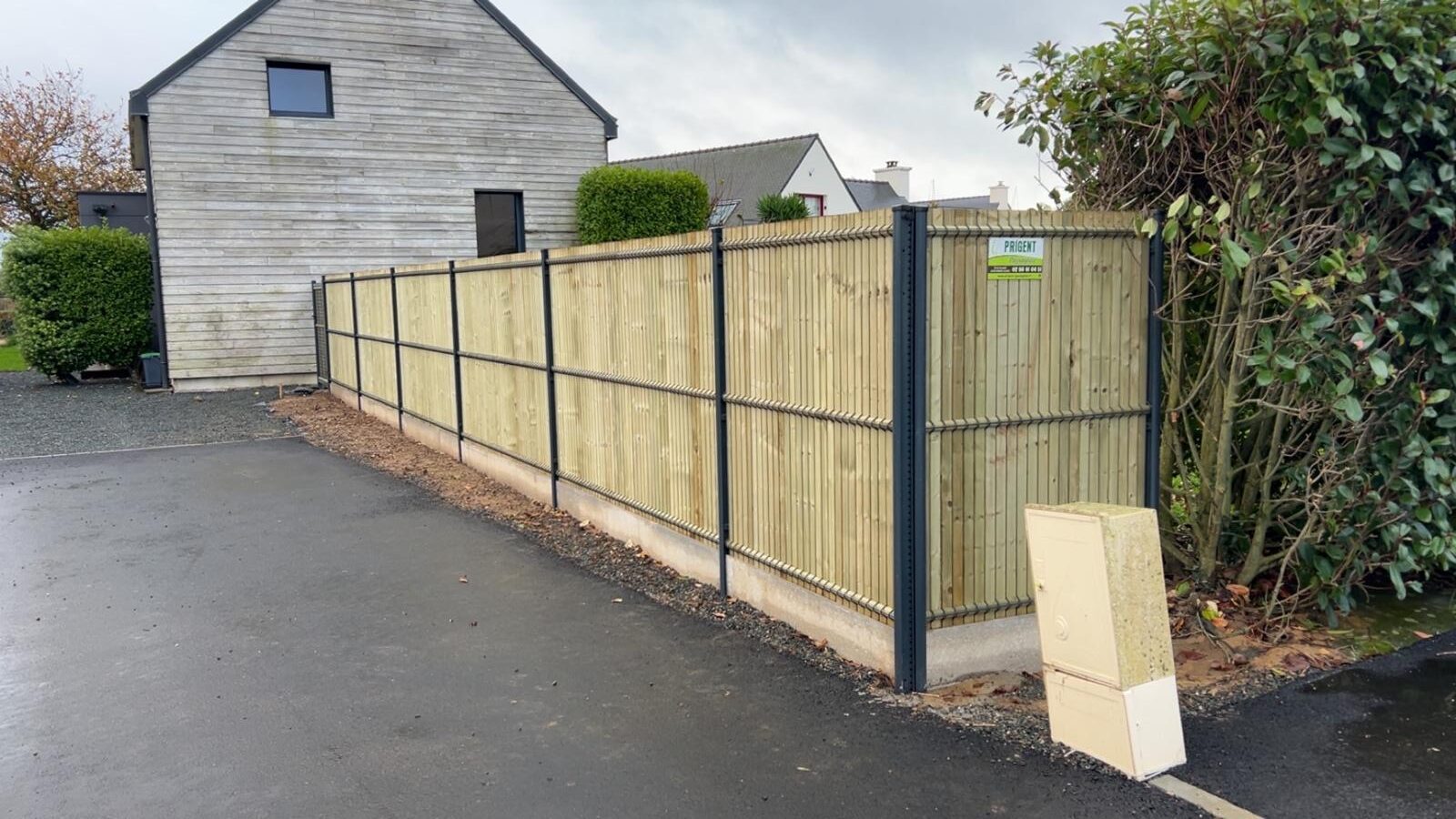 Installation d’une clôture en panneaux de bois autoclave (Classe 4). Cette solution naturelle offre un excellent rôle de brise-vent et de brise-vue, créant un cocon chaleureux dans le jardin. Les poteaux sont scellés solidement pour résister aux vents de la côte.